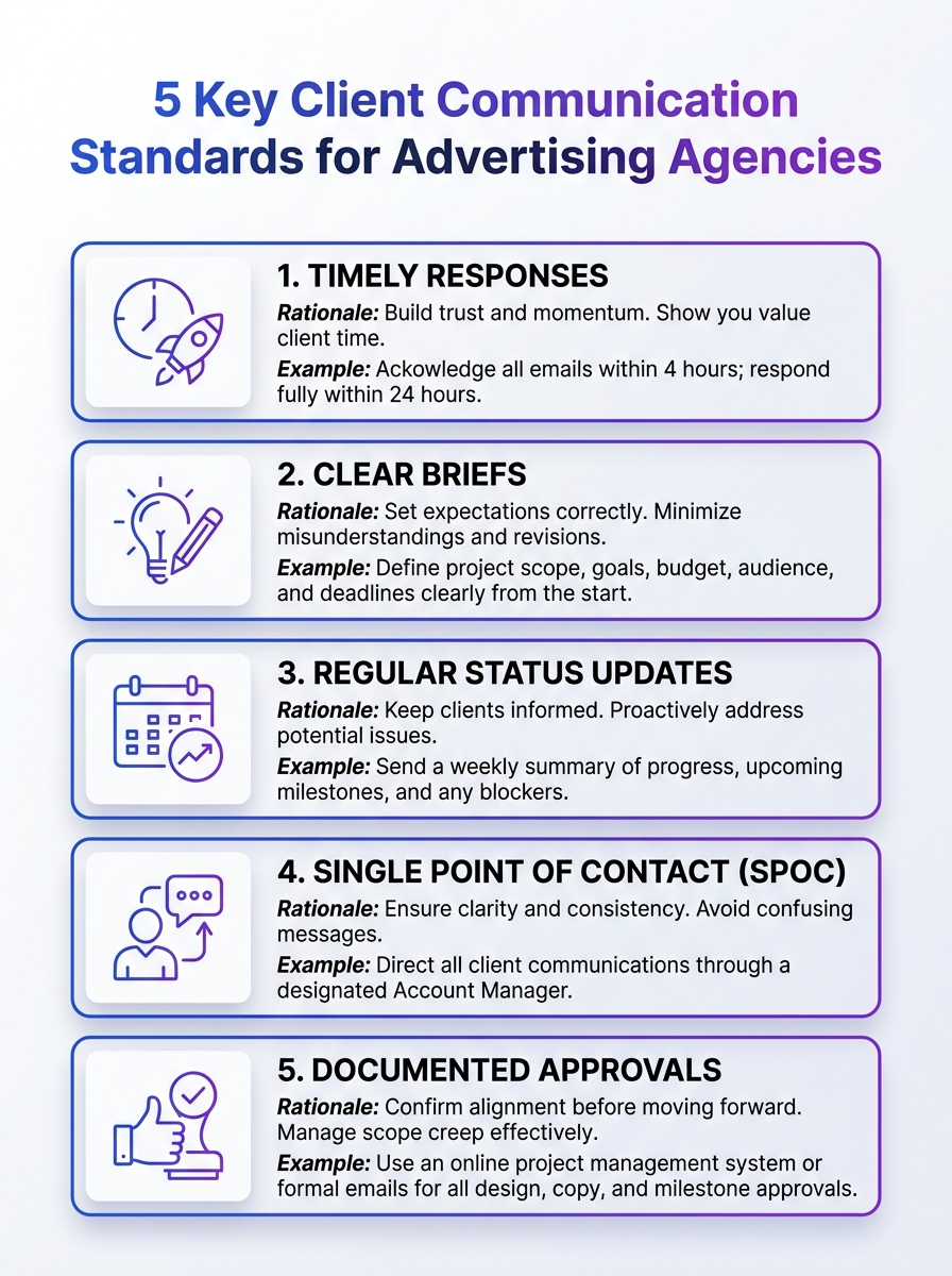 A concise visual guide outlining the 5 key client communication standards for advertising agencies. It helps teams align on briefs, feedback, and timelines.