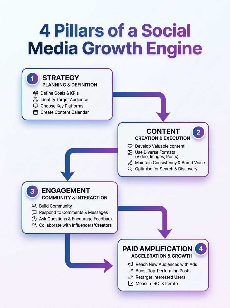 A concise visual guide to the four pillars driving a social media growth engine, with actionable steps to implement them.