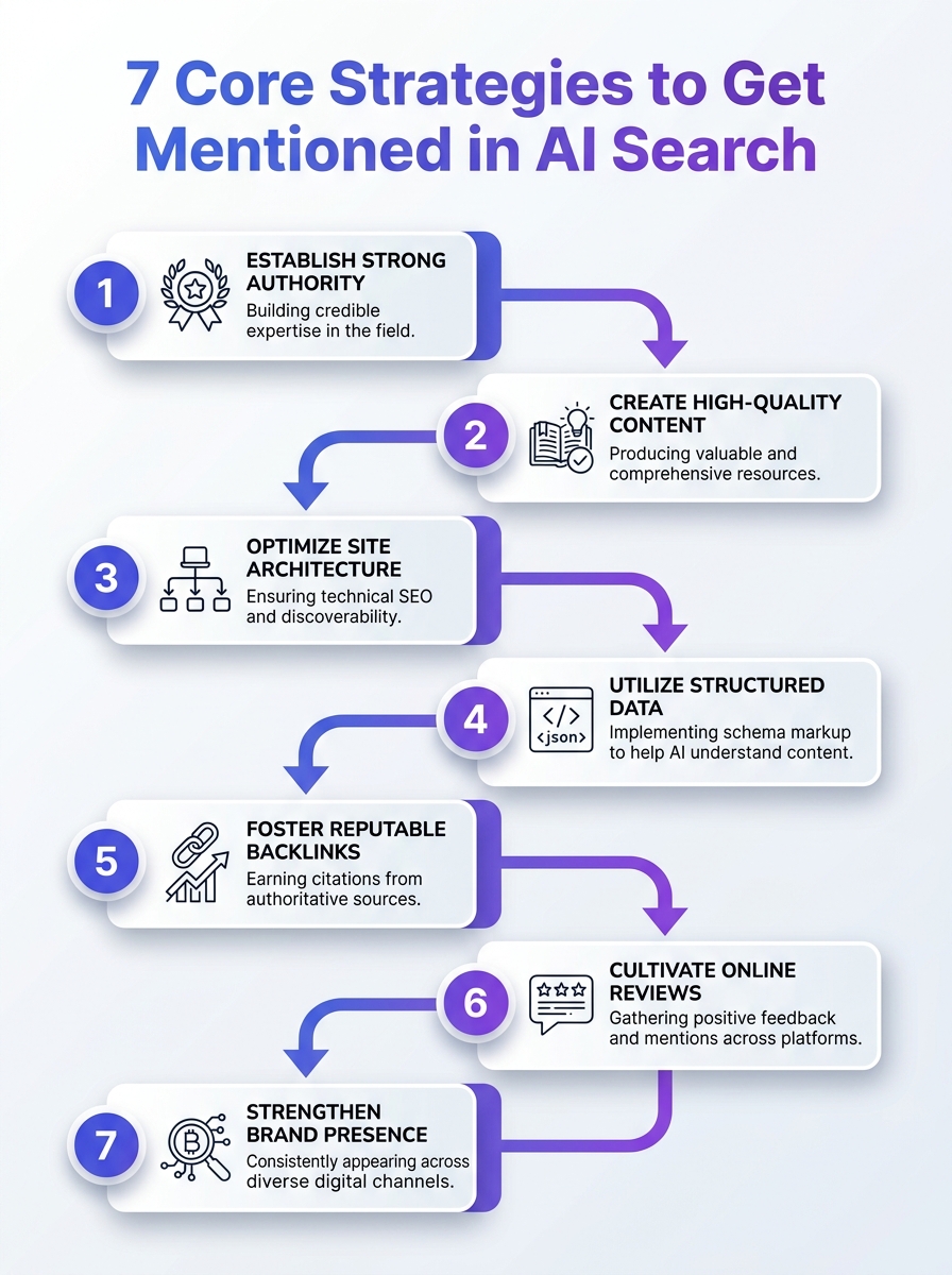 This infographic visualizes seven core strategies to get mentioned in AI search. Apply these steps to boost visibility in AI-driven search results.